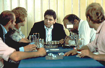 It’s striking that this bleak, overtly stylised film should have been a commercial hit. Whilst Fassbinder draws upon Sirkian melodrama, no one would mistake this for a Hollywood film. Fassbinder had the talent to create an almost surrealist mise en scène from a banal setting. For example, Irmgard is framed against a shop window featuring a wedding dress when she’s mistaken for a prostitute in the street; the image above shows Hans pontificating about how hard done by he is to an almost mute coterie of men.