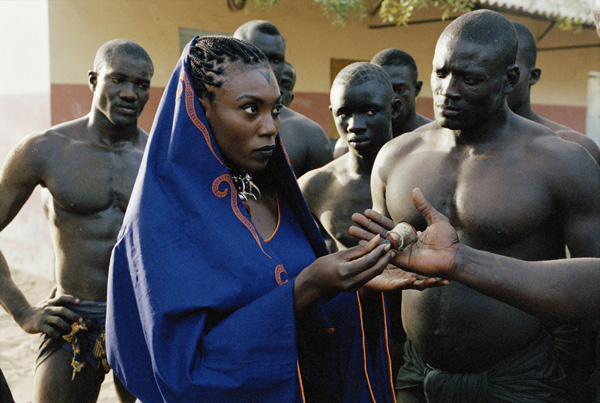 I don’t want to give too much of the entertaining plot away, but in the third section the film shifts into what some scholars of African Cinema have called the ‘return to source’ mode. This is a reference to folklore, African religions and African history pre European colonisation. The image above points to this in the appearance of a troupe of wrestlers wielding machetes and working initially for Fatamatou – a woman with interesting powers. In order to survive Black has to be ‘reborn’ as the lion. At this point I was reminded of the old Paul Robeson movie from the 1930s, Song of Freedom, in which an African in London returns to Africa to fulfil his destiny. Black plays this much more lightly and tongue in cheek, but that authenticity is still there.