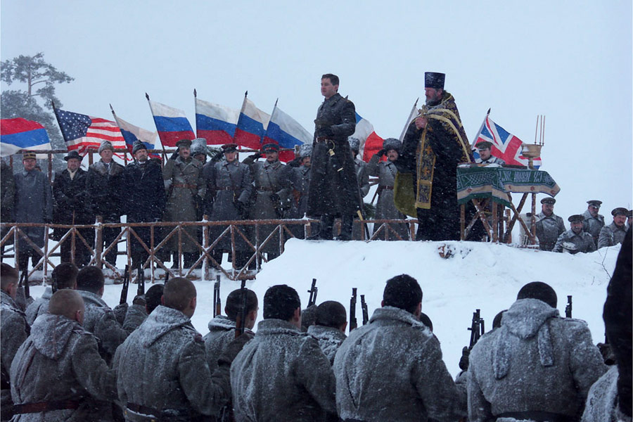 For me the most interesting aspect of the film is its ideological work. It’s always an odd experience watching a film in which you find yourself being asked to follow the exploits of the enemy when your own side is not being shown. Not that this is impossible since I’ve never really had a problem with supporting Sergeant Steiner and his men in Peckinpah’s Cross of Iron even if they are part of the Wehrmacht fighting the Red Army. But that’s because they are professional soldiers simply trying to survive and ignore the Nazi officer who they distrust. In the case of Admiral, however, we are asked to support a man who became what some commentators have termed a proto-fascist dictator as ‘Supreme Chief of Russian Forces’. His own ideology seems to be church and ‘homeland’, expressed in patrician and aristocratic terms. The film makes no attempt to humanise the Bolsheviks and they are represented as little more than thugs in most cases – apart from some of the guards in the final sequence. I did quite like the ways in which the guards struggled to find different ways to address the Admiral in the new language of the revolution. ‘Mr Kolchak’ was the last one I think (according to the subtitles).
