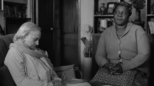The film’s prologue refers to a trait of European colonial narratives, especially about Africa and the ‘heart of the continent’. What we see is then revealed to be a film being watched (seemingly on her own in a cinema) by Pilar who we later realise is a single woman with an interest in human rights issues around the world. She is, we assume, an internationalist Catholic, at one point dealing with a ‘Polish nun’ who may be coming to visit her in Lisbon and at other times perusing websites or taking part in peaceful demonstrations. Yet Pilar is still subject to the circulation of colonial narratives within which Aurora is forever trapped. Aurora has a carer/housekeeper, an intriguing character called Santa. Is Santa from Mozambique? Aspects of the narrative suggest not. In a revealing scene we see Santa reading Robinson Crusoe and then later attending a class in which she tells the teacher what she has been reading. “Extraordinary!” is the teacher’s response – and indeed it is. What should we make of this? One suggestion is that Santa is ‘free’ of the past and able to study it dispassionately, while Aurora is still caught up in it. Santa isn’t a naïve young woman. She’s older and wiser and carries out her duties in a professional way, betraying no sense of the legacy of a colonial relationship.