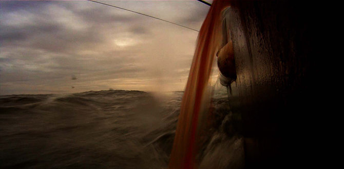 What they present from the sea is difficult to describe in print. It is as kaleidoscope of images and sound. Using multiple cameras and sound sources the film races across fishing ship, the fishermen, their equipment, the sky and sea around, the birds above and the fish beneath or finally on board. Apparently they used miniature HD cameras strapped to their own heads and those of the crew. It looked like they also trailed them in the water. Much of it was shot at night and the discernible image often occupies only a fraction of the screen. The editing is frantic much of the time, the cutting emphasising how little we see or recognise. We see as ‘if through a glass darkly’ and often with only a partial sense of what the camera records. It is not clear how many boats are involved – the filmmakers were aboard a fishing boat Athena. It seems it trawls for varied catches including a variety of fish and shellfish.