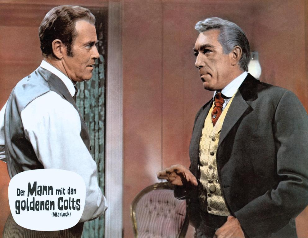 The film is unsurprisingly in CinemaScope, which is fine, but I thought that the DeLuxe Color had a rather yellow palette. I’m not sure if this was intentional or whether it was not a priority in the restoration. Overall, I didn’t think Dmytryk made the most of the location of the story in Utah. The extreme long shot in the opening looked like a model until the tiny figures moved. But clearly the film is about the characters. It’s a narrative in which characters actually seem to change in order to deliver the conventional resolution and along the way there is a hint that Quinn’s devotion to Fonda’s cause might be be based on more than just old times’ sake. In his paper on ‘Social class and the Western as male melodrama’ in the Movie Book of the Western, David Lusted includes an analysis of Warlock. He places it as a ‘township Western’ and discusses it in terms of the split between romance and melodrama, bracketing it with similar films of the period which he describes as ” . . . clearly melodramas, disturbed and disturbing, at times hysterical in their character relations and fevered in their crises of male identity”.