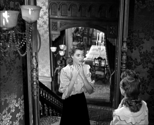 Melodrama implies other familiar conventions. Helen is affected by her trauma so that she can’t speak – and therefore can’t ask for help or convey what she knows quickly. In the scene above she looks at herself in the mirror, a common image from melodrama that might suggest that there are two Helens or that she has something to hide that might not be revealed to the other characters. The mirror also allows the composition of images which are ‘disrupted’ in their presentation of narrative space. Here the deep focus which operates throughout the film shows the dining room below. In this case, the mirror image helps conjure up Helen’s fears that being unable to speak will be dangerous in the febrile atmosphere of her gothic surroundings. This image also gives an indication of the detailed set design and ‘set dressing’ which adds greatly to the power of the images. The art direction duties are credited to Albert S. D’Agostino and Jack Okey. D’Agostino worked on 27 films released in 1946. The Spiral Staircase certainly benefits from the experience and expertise of personnel working within the studio system. Helen’s ‘lack’ of a voice is also a feature of certain melodramas where such ‘lacks’ are often seen as symbolic. In this film, the lack is also imagined by Helen in a sequence representing her internal thoughts and in another where a visual effect obscures her mouth.
