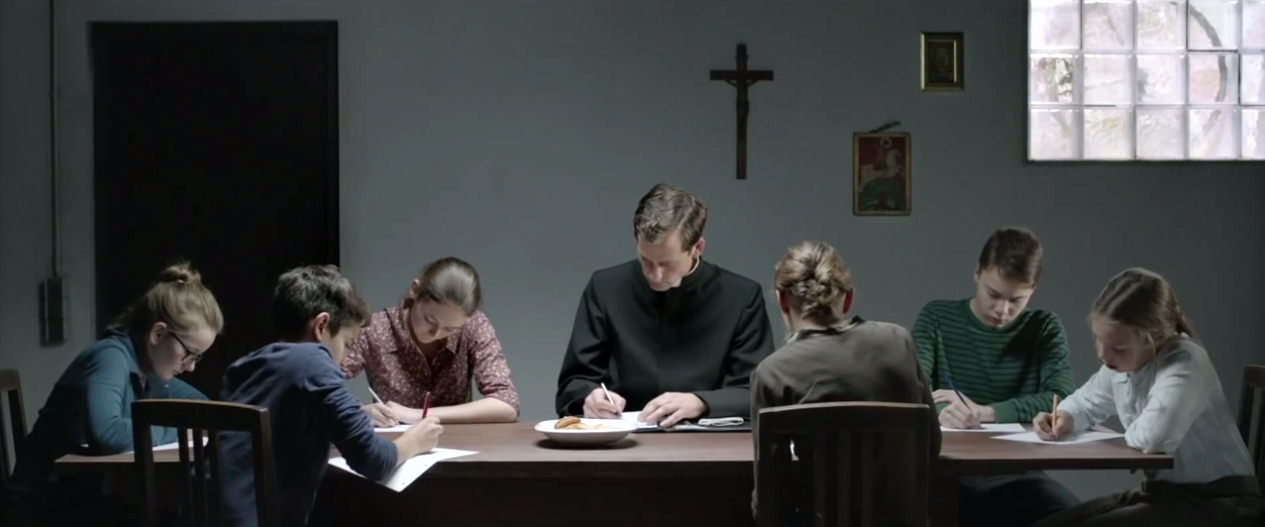 Brüggemann first experimented with a fixed camera and long static shots in his 2006 feature Neun Szenen (Nine Scenes). In Stations of the Cross, he works with long-time collaborator Alexander Sass to take it to another level: in the whole film, the camera moves only three times. The effect is to create a series of carefully composed painterly tableaux that evoke the traditional Christian iconography of the 14 stations of the cross. On second and repeat viewings we are reminded of the original contemplative purpose of these images, but I feel Brüggemann’s aim is less spiritual than ironic. The opening tableau for example, reminds us of da Vinci’s Last Supper, foregrounding Father Weber as a false prophet whose ‘meal’ is a perversion of Christ’s. Credit should also go to production designer Klaus Peter-Platten for mise en scène decisions that intensify what Brüggemann calls ‘locked-in’ shots. In the first and the later confessional scenes, dim lighting and austere stage sets with tiny windows, severe horizontal and vertical lines signify the imprisonment of vulnerable minds like Maria. Through the confessional grille, Father Weber even admonishes her for ‘sins’ of her innocent imagination: pride in hoping that a boy would find her attractive and conceit for knowing the truth – that she would be a better mother to her brother. Time and again, she is presented as powerless and invisible, pushed to the edges of the frame. For example in Station 2 and 7, when she battles with her mother and then her gym teacher, she is forced to the other side of the frame, underscoring the futility of her resistance. In Station 9, as she awaits confirmation, her pale profile is lost amongst those of other children, and at the critical moment she even disappears below the frame.