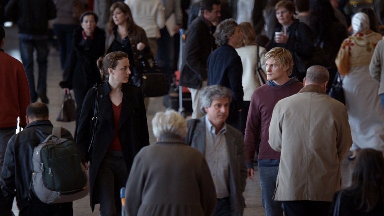 The four couples are a mother and teenage son going to the funeral of the ex-husband and father, a pair of German tourists, a couple splitting up (one of whom we see at Orly as she reads the a letter from her husband) and two expats who meet by chance and discover that they are both returning to North America. The peripheral characters include a young woman on an airline counter, a young barman, taxi drivers etc. and a woman with a baby she is trying to comfort. Although there are brief moments of contact with these individuals by some of the couples, the main way in which Schanelec links her characters is through her camera (or rather the camera of her regular cinematographer Rheinold Vorschneider). For example, in one sequence we are offered a long shot across the departure waiting area with many people sat waiting and others moving in the background, but careful use of the field of focus is able to pick out one face in the crowd. This character will be identified later in the film as the man in the fourth couple. I recognised him as Jirka Zett from Schanelec’s earlier Nachmittag (Germany 2007). See also the shot above in which the same character briefly makes eye contact with the woman separating from her husband. I’m still not sure how this camera shot was achieved. At other times I wondered if Schanelec was using radio mikes for her characters. It is clear that in the Orly shots, the fictional characters are simply placed amongst the crowds of ordinary passengers at the airport. Vorschneider shoots from some distance away so that there are figures in the background and moving across the foreground. You can see this in the trailer below when the two expats (Natacha Régnier and Bruno Todeschini) are talking. The only way to capture ‘direct’ sound for dialogue would be to use concealed radio mikes. Does anyone know if Schanelec uses this method? I was first aware of it in Michael Winterbottom’s Wonderland (UK 1999), one of my favourite films for representing a city through a form of realism. Most of the time the soundtrack uses only dialogue plus the direct ambient sound of the airport. It is a shock therefore when after an hour of this we hear a voiceover reading a letter and Cat Power’s performance of the song ‘Remember Me’