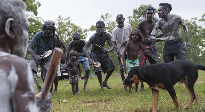 When Gulpilil’s narration refers to the ‘old ways’, I got the impression that Reynold’s camera either found a bush scene with natural light effects or that the film had been processed to produce effects. I was reminded of Ten Canoes and this in turn set up my confusion with the overall presentation of the community. (I should point out that Gulpilil tells us that one of the problems in Ramingining is that the government moved different Indigenous groups, with different customs and languages, into the town and thus created tensions – ‘community’ here means multiple groups.) In Ten Canoes, directed by Rolf de Heer with narration by David Gulpilil and stories from his Yolngu people, we are offered a highly sophisticated film narrative covering three distinct time periods and recreating a traditional annual hunt, by canoe for goose eggs. This required the recreation of rituals last carried out in the 1930s and now almost forgotten but which were captured on archive photographs by an anthropologist. In the promotional material for that film, Gulpilil emphasises how his people are both rooted in their own culture but also plugged in to modern communications such as internet banking. David Gulpilil himself is a complex individual. Australia’s best-known and most honoured Indigenous actor, writer, artist, dancer and more. He first appeared as a teenager in Nic Roeg’s Walkabout (UK-Australia 1971) and has appeared in many Australian films since with all the celebrity implications that implies. Yet he also shares some of the experiences of his character Charlie in Charlie’s Country. He’s had problems in the past with alcohol and he’s been to prison twice he tells us in the narration. He appears in the documentary but he tells us “that’s enough about me” and he doesn’t become a focus for the film overall apart from his narration.