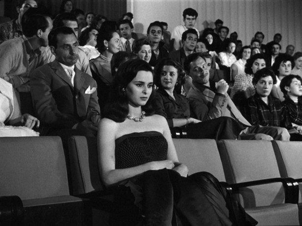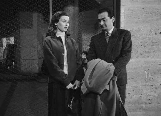 What then of La signora senza camelie?, one of three films that Antonioni directed or part-directed in 1953. Neo-realism was still a recognisable influence in Italy in the early 1950s and it certainly informs some of Enzo Serafin’s cinematography in the film. (Serafin worked continuously from 1942 and in 1954 shot Rossellini’s Viaggio in Italia.) The narrative is familiar. Clara (Lucia Bosè) is a shop girl from Milan, an outstanding beauty who has been snapped up by a pair of film producers. They have put her into a mundane exploitation film and when the narrative of La signora senza camelie begins she is waiting in the street outside a cinema where her debut is being previewed in a public screening. These opening shots seem to promise distinctive location shooting. What follows certainly has neo-realist moments, especially because of the cinematography, but it is primarily a melodrama and in generic terms, a film about the film ‘business’ rather than about filmmaking per se – though there are some direct comments about performance. There are ‘pre-echoes’ of certain well-known films. It’s difficult not to think of Godard’s 1963 Le mépris (1963) in which an American producer wants to put Brigitte Bardot into a ‘classical drama’. In La signora senza camelie, Clara marries one of her producers, Gianni (Andrea Checchi) who installs her in a beautifully furnished by soul-less apartment and then casts her in a version of Joan of Arc. She goes to the Venice Film Festival and is humiliated when the film fails. In the meantime she has linked up with another hopeless lover, a diplomat who is not prepared to risk being seen with her publicly. She would be better off with the experienced actor Lodi played by Frenchman Alain Cuny, who in one scene teaches her how to make love for the camera. The film’s title presumably refers to The Lady of the Camellias or simply ‘Camille‘, a novel and play by Alexandre Dumas, an opera, La traviata, by Verdi and then a film made famous by Greta Garbo. Poor Clara has none of the mystique of Camille (though possibly all of the beauty).