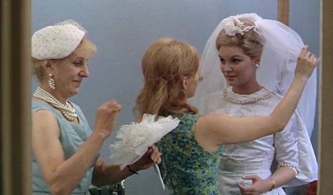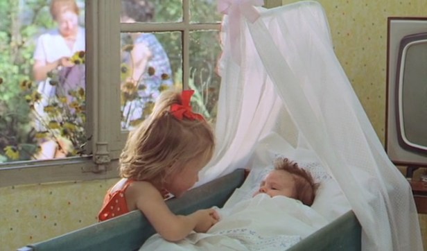The setting and the approach to filming Le bonheur is in line with Varda’s ideas throughout her career. The location is Fontenay-aux-Roses, a small community in the South-Western outer suburbs of Paris. In 1964 it must have still been almost like a rural village. François (Jean-Claude Drouot) works for his uncle’s small carpentry company. Drouot is tall and handsome and at this time he was the star of a French TV historical adventure series set during the Hundred Years War – perhaps that is why Varda names him François Chevalier (i.e. a ‘knight’). Drouot’s own wife Claire plays Thérèse Chevalier and the couple’s own small children play Pierrot and Gisou Chevalier (none of them are professional actors). Unsurprisingly, family life chez Chevalier often feels like it is being ‘captured’ by a documentary camera – and this extends to scenes featuring other members of the extended family and some of the scenes where friends and neighbours visit the small house or meet the Chevaliers in social situations. (Thérèse is a dressmaker and young women come to her for a wedding dress.) The family are seemingly blissfully happy during these summer months. But Varda has ideas about what ‘happiness’ might actually mean. I guess I should warn you if you haven’t seen the film or heard about its reputation. Many audiences have found the film ‘shocking’ for a number of reasons. The UK film certification board gave it an ‘X’ in 1965 (no one under 16). The DVD I watched carries an ’18’ certificate but the BBFC website lists a ’15’ (confusion like this is not unusual as tastes and moral codes change over time). The ‘advice’ from the board is that the film contains ‘sexualised nudity’. But this isn’t what shocks.