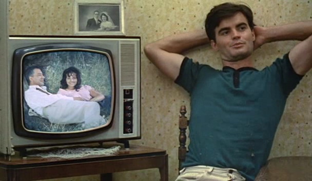 Le bonheur is not a realist film with a sociological underpinning, despite the documentary feel. It’s a film of playful devices and moments of intertextualities. The colours and aspects of the plot link it to Demy’s Umbrellas of Cherbourg – François met Thérèse during his military service and brought her back to Fontenay to marry. One of the strongest links is the tradition of al fresco eating that recurs in French art. At one point a film is playing on the TV set in the uncle’s home. The film is Jean Renoir’s 1959 Le déjeuner sur l’herbe (Picnic on the Grass). Both Manet and later Monet produced paintings with the same title during the Impressionist phases. Renoir himself had earlier used the ‘picnic’ as a vehicle to set up a multi-narrative, including seduction, in Partie de campagne (A Day in the Country, 1936). In Renoir’s 1959 film an older character pontificates about happiness. The odd thing about this scene is that the film is in colour, but as far as I’m aware, French TV did not begin regular colour transmissions until 1967. This anachronism is repeated with a reference to Viva Maria!, Louis Malle’s film starring Brigitte Bardot and Jeanne Moreau together for the first time. It was not released until the end of 1965 in France but Thérèse tells François she wants to see it. She also asks him (while stroking his back) “Which one do you prefer, as a woman?” “As a woman, you”, he replies. There is then an immediate cut to the carpentry workshop where we see that the door to the food cupboard is festooned with pin-up images of Bardot – and one of Moreau. At first, I thought we see François opening the cupboard door, but it’s one of his workmates. Even so, the cut reminded me of that moment in Truffaut’s Shoot the Pianist (1960) when a character swears on his mother’s life and a swift insert sees the old lady keeling over. Just before the Bardot/Moreau moment in Le bonheur, the image of François shaving is juxtaposed with a soap advert that fills the screen with ‘Un savon d’homme!’ (a soap for men!). The sequence immediately before this is a smiling Émilie behind the post office counter, clearly smitten with François. Varda tells a story completely through montage editing. The use of an advert is picked up in Amy Taubin’s essay for the Criterion DVD label which re-released the film in the US. She compares the film to Godard’s Two or Three Things I Know About Her (France 1967). That film takes ‘her’ to be both a wife and part-time prostitute as well as signifying Paris. The film is a commentary on consumerism and politics in the new, ‘modern’ Paris of 1966. In Varda’s film, made only two years earlier, the new high-rise flats of Paris are only glimpsed a couple of times in the distance. Otherwise her film is both ‘traditional’ in depicting small-town France and ‘timeless’ in its exploration of the mores of love and life and community. In the discussion of the film on the DVD, one participant sees it as a story set in a ‘Garden of Eden’.