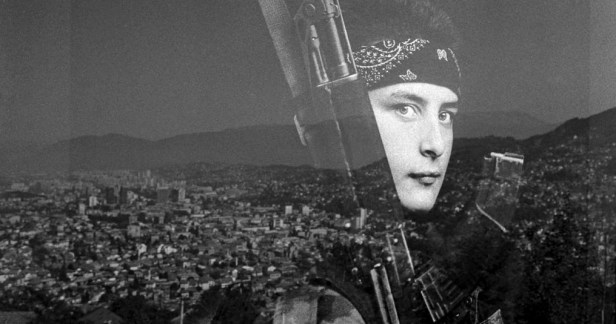 The thirteen directors, as indicated by the production nationalities above, come from several different countries. The four names most familiar to me directed contributions clustered together in the middle of the film. They are each quite distinctive. Jean-Luc Godard’s familiar large ‘banner’ statements in white upper case type are presented against still images and a montage of clips (I recognised at least one from Eisenstein). Similarly, Angela Schanelec shows us big close-ups of a small group of characters translating the statements of the 1914 assassin Gavrilo Princip with an un-blinking camera eye. Cristi Puiu offers us a long shot of a middle-aged couple in bed reading at Christmastime from a book which prompts the man to make several prejudicial remarks about various ethnicities and national groups in the Balkans – apparently it’s all the fault of Hungarians. The most striking visual treatment is from Sergei Loznitsa who superimposes large still photographs of combatants over street scenes from Sarajevo (both images in black and white). These superimpositions are striking and provocative – see the image at the head of this posting.