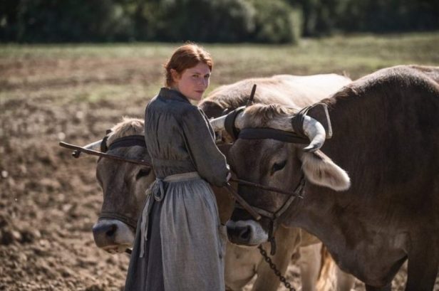 Nathalie Baye and Laura Smet are very good as the two women running the farm but Iris Bry is a revelation in her first film (of any kind, it appears). I couldn’t believe she was a novice and that she was ‘discovered’ working for her library qualifications. She looks and sounds the part and also sings beautifully. No wonder director Beauvois was staggered by how lucky he was. He says in the Press Notes (only available in French unfortunately) that he didn’t want a ‘modern young woman’ with modern manners and tattoos. He wanted a young woman who could have been a peasant in the 1910s and who could grow into a twentieth century woman. Iris Bry has the healthy body of someone who could milk cows, bale corn and do all the jobs around the farm and do so with an open and attractive face – and in the last section of the film could cut her hair into a style that announces a young woman of 1920s cinema. I think in 1915 she would have been thought of as a ‘bonny lass’. The film’s cinematographer Caroline Champetier has said that no matter how she lit a scene, the light would always find Iris, because she is naturally photogenic. I like Ms Champetier’s work very much and here she catches the moments in the day on the farm when there is a special light, whether it is in the mists of an autumn morning or the ‘magic hour’ of a summer’s evening. She also utilises the ‘Scope frame . Unfortunately I could not find stills to illustrate either of these points but both are there in the trailer below. The other important aesthetic consideration is the sound and the music score. The latter is by Michel Legrand but used quite sparingly and I enjoyed the silence in many scenes. Make sure you stay through the credits to catch all of Iris Bry’s singing.