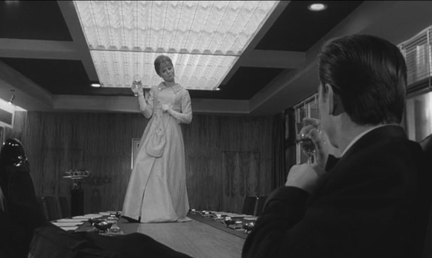 Like Simone Signoret, the ‘other woman’ in the first film, Honor Blackman presents an assertive (but in contrast, single) older woman. In her case she has come up from London as a reporter/presenter for regional television. It is a feature of mid-1960s British films to see work in TV as ‘modern’, whereas earlier, in the 1950s, TV is often treated as simply cheap entertainment, stealing audiences from cinema. Honor Blackman is a fascinating figure in British film and TV. Her long career featured a relatively small proportion of significant leading roles but in 1965 she was perhaps at her peak of public awareness having appeared for two years as Cathy Gale in the hit TV series The Avengers (1962-4) and as Pussy Galore, the most memorable ‘Bond Girl’ (she was 38) in Goldfinger (1964).
