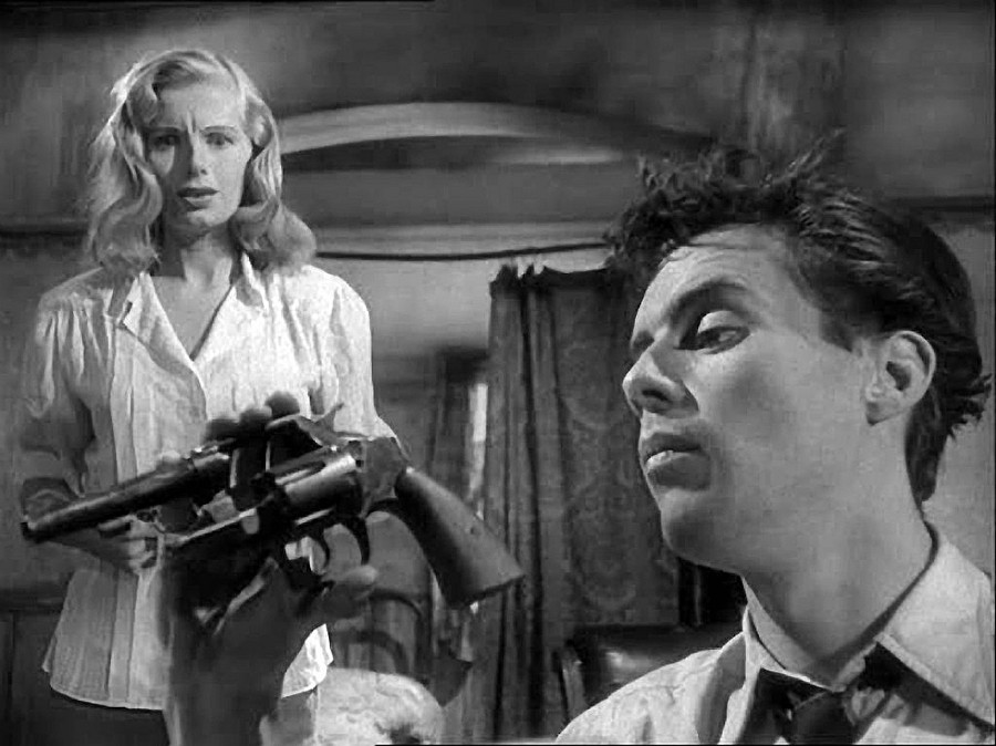 In its second section the film becomes more of a ‘social-realist’ police procedural with Hanley’s ‘Andy Mitchell’, a younger policeman, being taken in by PC George Dixon (Warner) and his wife (Gladys Henson). A line of dialogue suggests that George and Em’s son was killed in the war and would have been Andy’s age by now. Andy represents the sensible younger man (‘up from Kent’) who can be contrasted with the ‘tearaways’. Jimmy Hanley had been playing this type of younger man for some time – he was actually in his early thirties. During this part of the narrative, the police team at Paddington Green begin to investigate a robbery at a jeweller’s. The crime is committed by Tom Riley, the Bogarde character, and also involves his male partner ‘Spud’ and Tom’s girlfriend, 17 year-old Diana (Peggy Evans). Inevitably the first crime leads to a second and in the process PC Dixon is shot. This pushes the narrative into a new form in which Ealing Studio’s well-known use of realist location shooting is used to create a very exciting car chase around the Paddington-North Kensington area and ending with the murder suspect running into White City Stadium during a greyhound racing meeting. Although similar scenes had already been seen in earlier Ealing pictures (e.g. It Always Rains on Sunday, 1947), the intensity of the police chase with radio cars seems to be much greater on this occasion. Many commentators, especially in the US, relate the final chase sequence to the Hollywood ‘semi-documentary’ of the late 1940s, picking out Jules Dassin’s The Naked City (1948). I think there is something in this, although Fritz Lang’s M and other earlier British crime films are also an influence. The other oft-quoted reference is to film noir and there are certainly several noirish scenes in the film. On the other hand, many Ealing dramas of the period use familiar noir lighting and camerawork for a range of narratives in this period, most of which are not films noirs as such but rather crime melodramas or straight dramas.