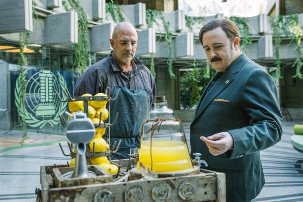 The idea for the film is to present a future world (‘9177, give or take a thousand years’) in which civilisation on earth has been reduced to one imposing building plonked down in a landscape that evokes Monument Valley, Utah, aka ‘John Ford’s American West’. Outside this building which houses the rich and powerful is a rural trailer park in a woodland clearing where the ‘ordinary people’ live. The simple narrative involves one of those from ‘below’ attempting to enter the ‘palace’ above (which operates more like an office block or a conference hotel) and to sell fresh lemon juice door-to-door. This is not allowed since the King alone licenses traders, of which there must be three (no more, no less) for each service or commodity. Eventually our frustrated hero will lead an insurrection and fall in love. I won’t disclose how this works out.