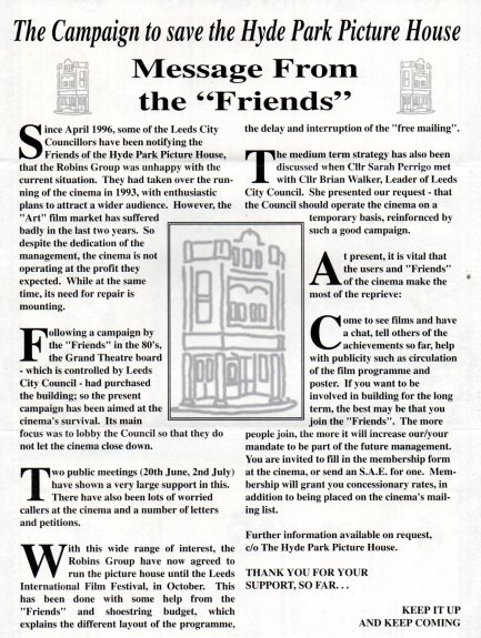 It was the friends who were instrumental in saving the cinema when the owners, the Robbins, decided to close. They campaigned successfully for the Leeds Council to rescue this local landmark and cultural venue and it subsequently became part of the Grand Theatre Trust.