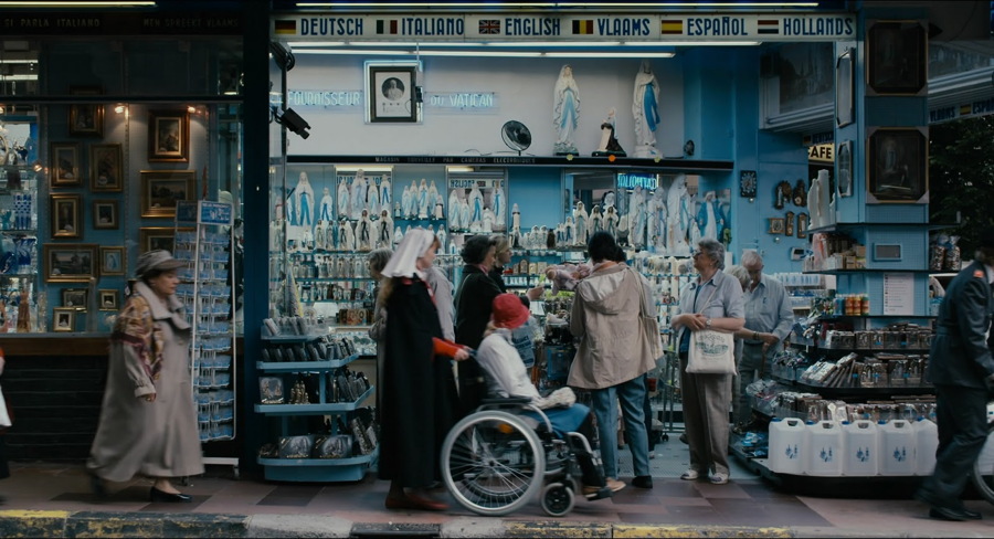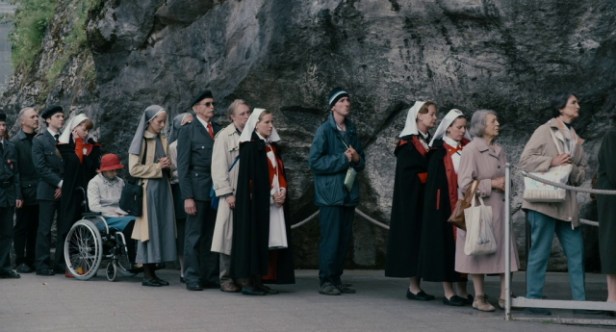 Hausner’s approach to her story is governed by a sense of distance and an observational stance in the early parts of the film. She represents Lourdes itself much as it might appear in a documentary as members of the group queue up to experience the waters and visit sacred places. The dispassionate camera also records the stalls selling souvenirs and religious icons. Once we have become familiar with the specific group of pilgrims and the helpers, the sometimes static camera offers us wide shots. These are especially evident in the formal services and social gatherings, allowing us to note the different forms of behaviour of the pilgrims, including some competitive moves to get closer to the celebrant who is offering blessings etc. The narrative begins to resemble a comedy of manners which includes both the pilgrims and the carers. We also learn that there is a prize for ‘best pilgrim’ and that the main hope is that somebody will experience a ‘miracle’ which leads to partial or complete recovery from their affliction.