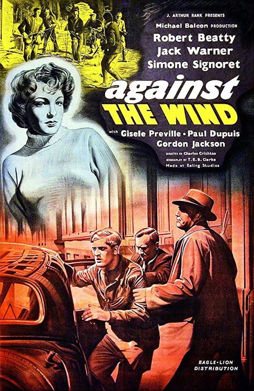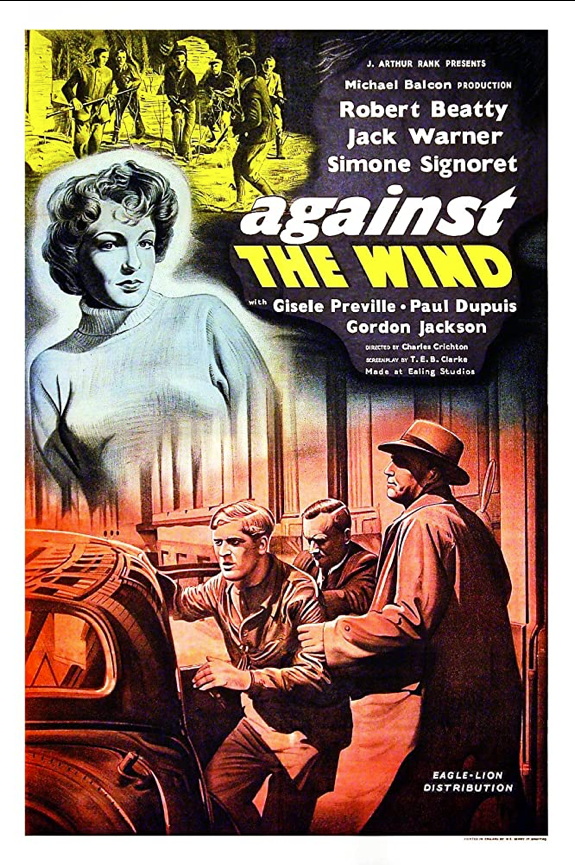 As well as the location shooting, Against the Wind, features a European actor who would go on to greater things. Simone Signoret plays an SOE (Special Operations Executive) operative in the first of her four British films. She had worked in bit parts in French cinema under the German Occupation (her part-Jewish background meant she couldn’t get an actor’s permit) and she was only just beginning to establish herself in lead roles in French films after the war. She had worked alongside Françoise Rosay in 1946 on the French feature Back Streets of Paris. Rosay had appeared in two Ealing films in 1944-5 and perhaps she made the connection with the studio possible? Simone Signoret was following Mai Zetterling who played a German young woman in Frieda and again, later,  in Portrait from Life as a European actor giving more authenticity to roles in British films made partly in Europe. Simone Simon appeared in a Georges Simenon adaptation, Temptation Harbour in 1947. The other two French-speaking roles in Against the Wind are played by the French-Canadian Paul Dupuis (in UK films since 1943) and the French actor Gisèle Préville, another occasional visitor to UK film productions.