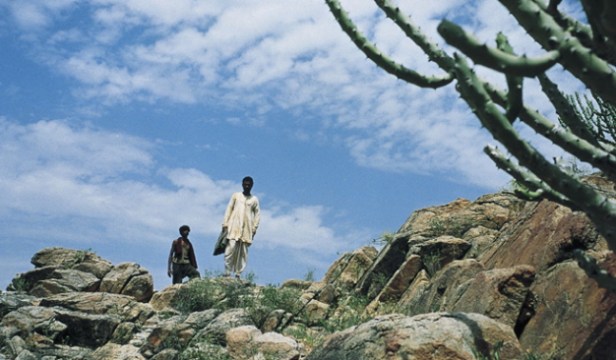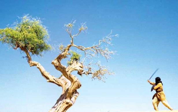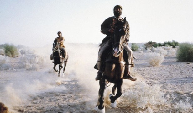 Film 4, one of the UK partners involved has long been a supporter of Indian cinema in the UK, albeit in the early hours of the morning. Still, it has links to Indian film industries and film culture and in 1994 had funded a controversial diaspora film by Shekhar Kapur, Bandit Queen. The Warrior is a very different kind of story with Kapadia and co-writer Tim Miller turning to Japanese folk-tales (presumably the reason why ‘the warrior’ is known as ‘Lafcadia’ in some listings, a possible reference to Lafcadia Hearn the Greek-Irish writer famous for his books on Japanese ghost stories). If the story is Japanese, the film also draws on Japanese cinema as well as Chinese cinemas (Taiwan/HK?) and spaghetti Westerns (which also derive from Kurosawa et al). The film narrative is very simple. ‘The Warrior’ (he isn’t named in the film) becomes disgusted with his feudal lord’s commands which mean executing tenants who can’t pay annual rents and raising villages to the ground, killing everyone. When he rebels, The Warrior becomes an outlaw pursued by the lord’s other warrior retainers. After his son is executed by his enemies he escapes to the desert, but he is finally saved by his companionship to a boy and to a girl and her family. The plot involves some ‘magic realism’ in terms of the girl. The desert scenes were shot in Rajasthan and the mountain scenes in Himachal Pradesh. I was struck by the several shots of lone trees in the desert and the use of extreme long shots covering the journeys taken. Some of these made me think of traditional East Asian visual art rather than the style of contemporary Indian cinema. I’ve included several images of the ‘long shot style’ here.
