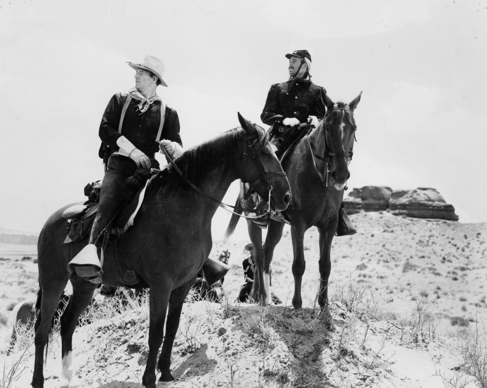 Thursday not only ignores York’s advice but pushes aside his objections about breaking his word to Cochise. Thursday is depicted as a racist from the East, obsessed with his own honour and adherence to Army regulations. The reason he is so bad-tempered throughout is that he believes he has been doubly punished by an ungrateful US Army. His wartime promotion to General was downgraded after the war ended (this was standard practice, not a personal rebuke) and he was sent to the “God-forsaken outpost” of Fort Apache. By contrast, Kirby York accepted his posting after similar success in the Civil War and has found a way to negotiate with the Apache and also to be at ease with the community of the fort. Why then does York at the end of the film praise Thursday’s bravery and attachment to discipline when asked a question by a journalist visiting the fort? The answer, I think, is embodied in the way in which York praises the whole cavalry regiment and maintains that those lost in Thursday’s fatal charge are not gone but ride on with the everyday soldiers who now defend the frontier.