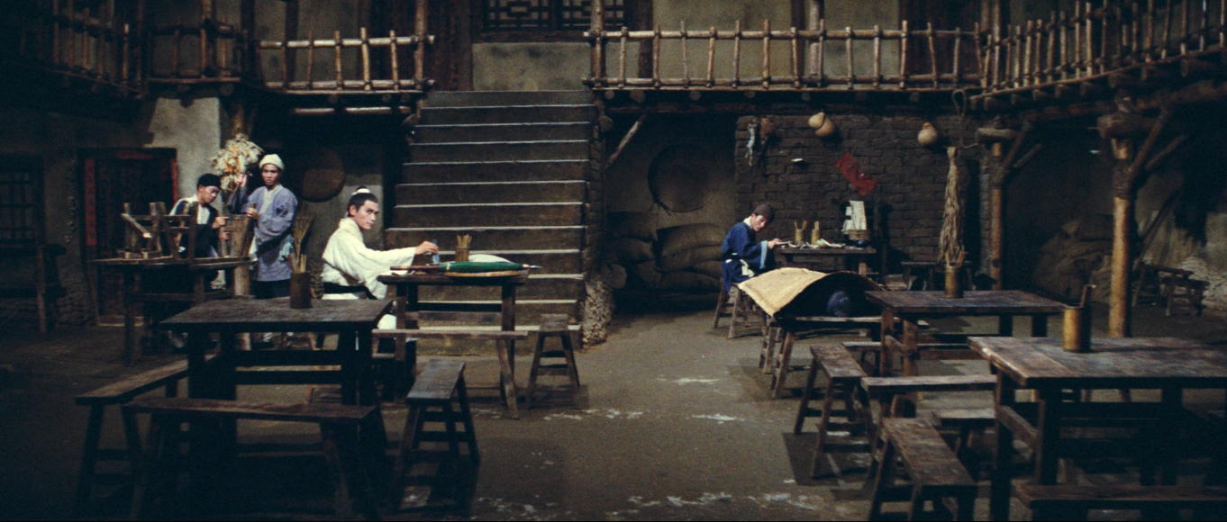 There are several reasons why Dragon Gate Inn became a massive hit in Taiwan and later Hong Kong (where Shaw Brothers delayed the film’s release to help one of their own films. Whatever you might think of action films and ‘martial arts’ films in particular, watching this film for ten or twenty minutes will convince you that Hu was a master filmmaker. Hu was originally an actor and an art designer before becoming a writer-director. In wuxia the characters are individuated through action and the visual qualities of their performances, including facial gestures and body postures as well as their martial arts skills and athleticism. Hu handles his actors well and he makes excellent use of his resources. There is just one studio set in the film as far as I can see – the inn itself which offers many opportunities for imaginatively-staged action set pieces – overturned tables, staircases, roofs, balconies, balustrades, windows/doors etc. This is then contrasted with the vast open spaces of deserts, mountains and river-beds. The Taiwanese interior offered so much more than the limited spaces of Hong Kong and Hu presents them on screen using CinemaScope ratio (2.35:1) and often extreme long shot framing by Hua Hui-Ying. But what makes him a special director is the ease with which he shifts from extreme long shot to close-up and a whole range of framings. His staging in depth is equally impressive.