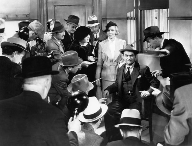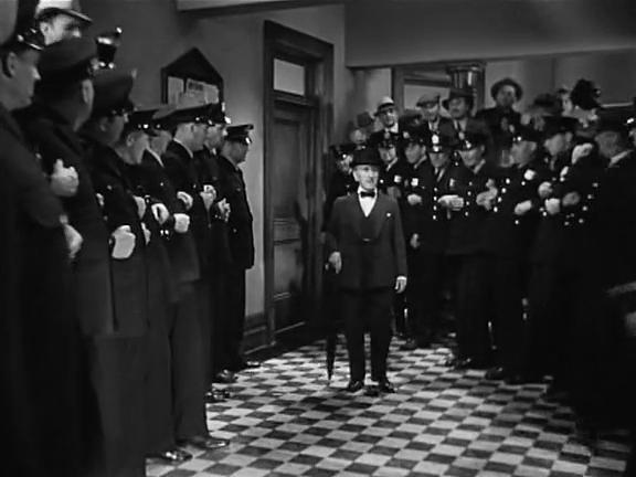 There is an enormous energy about the film in its crowd scenes, partly because Robinson and Arthur give lively performances and partly because of that strange convention that bedevils Hollywood crime films, causing police to arrive armed to the teeth in busloads and every photographer in the city jostling for space in the press briefing rooms. Ford and August handle all these scenes with aplomb and it’s interesting to see Ford working in this swift kind of screwball comedy. There is some remarkable optical work in doubling Edward G. without the use of digital FX. There are also some nice sight gags including the one above of Ettiene Girardot as Mr Seaver, Jonesy’s boss. I don’t think it’s making fun of a short man to enjoy the difference in height. There is an exciting finale but the weakness in the film for me is a failure to fully exploit the potential of Jean Arthur’s character, i.e. the screwball comedy elements get lost in the mix. (The Blu-ray disc includes an enthusiastic and enjoyable presentation on Jean Arthur’s career by Pam Hutchinson, but unfortunately there isn’t very much about her work on this particular film.) There is a suggestion that aspects of the original story don’t appear in the final cut as there were concerns that they would contravene the newly operational Production Code, so several plot developments take place off-screen (a kidnapping and Manion’s violence in prison). Having said that there is already a great deal squeezed into the film’s running time of 93 minutes. Two bits of IMDb ‘trivia’ are worth mentioning. First there is one of the worst ‘goofs’ I’ve ever seen in a Hollywood feature in which either continuity or the edit team missed the consequences of an action. It drove me mad for a while – Ford did have a reputation for sometimes not worrying about tying up loose ends. The second trivia point is that IMDb claims that this film prompted a Hindi cinema Shah Rukh Khan starrer Duplicate in 1998.