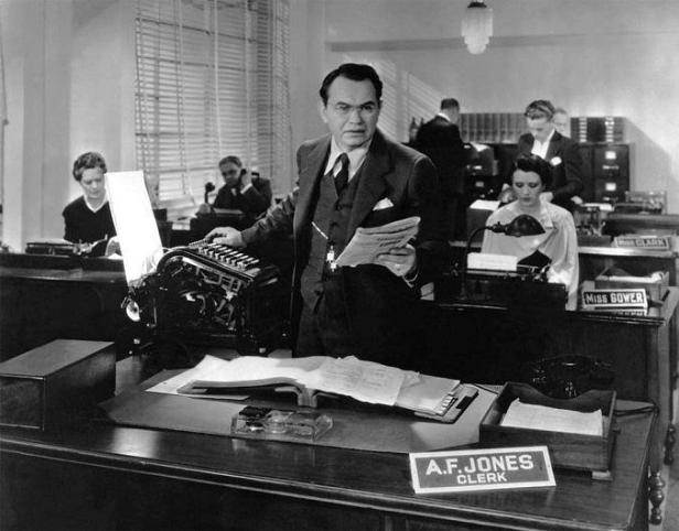 As soon as the film begins we experience a glorious tracking shot along the rows of desks in an office. It isn’t on the scale of the famous shot from The Crowd (1928) but in its own way it is just as beautifully choreographed. One of the extras on the Blu-ray is a video essay by Tag Gallagher which analyses much of the camerawork. It’s necessary to set up the office and the first comedy situation as the little man who runs the office becomes faced with a dilemma because the one person who is missing is Arthur F. Jones, the mild-mannered accountant played by Edward G. Robinson. I won’t spoil the gag. Jones is the central character in the narrative, except that he has a doppelgänger, a murderous gangster, ‘Killer’ Manion, who has escaped from prison and is suspected of being somewhere in the city. Inevitably, Jones will get arrested as Manion and then inveigled into a scheme to try to catch the real Manion. It’s a classic comedy, and especially romantic comedy, idea for constructing a narrative. In her role as ‘Miss Clark’, Jean Arthur is the single woman in the office who ‘Jonesy’ (as she calls him) secretly admires. His role as Manion’s double will bring them together.