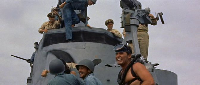 James Garner is Lieutenant J.G. Kenneth Braden who has been trained as a naval demolition engineer and as a Japanese language expert. The film opens with a romantic sub-plot which sees Braden secretly checked out by an attractive young woman from naval intelligence. Unaware he has passed a test, Braden is then shipped to Pearl Harbour and soon finds himself on board the Barracuda, a submarine under the command of Commander Stevenson (Edmond O’Brien). Braden’s mission seems ambitious and potentially dangerous for not just himself but also for the whole crew of the submarine – but only he and Stevenson know what it is. Stevenson has to get the sub close to a Japanese-occupied island so that Braden can get ashore unseen and carry out a daring spying operation – and then return undetected. If he succeeds he will have obtained vital information for a planned attack by US forces. If he fails many men will be killed in future action. What this narrative will then produce is a familiar underwater thriller in which the submarine faces Japanese aircraft and destroyers on its journey to the island and then a tense suspense thriller as Braden carries out his mission. The submarine drama is also driven by the confrontation between Braden and Stevenson as a ‘by the book’ captain whose actions are militarily ‘correct’ but perhaps not understood by his men. The light relief from the drama is provided by Alan Hale Jr., the son of the jovial character actor at Warners in the 1930s, who would later become famous for Gilligan’s Island on US TV (1964-1967).