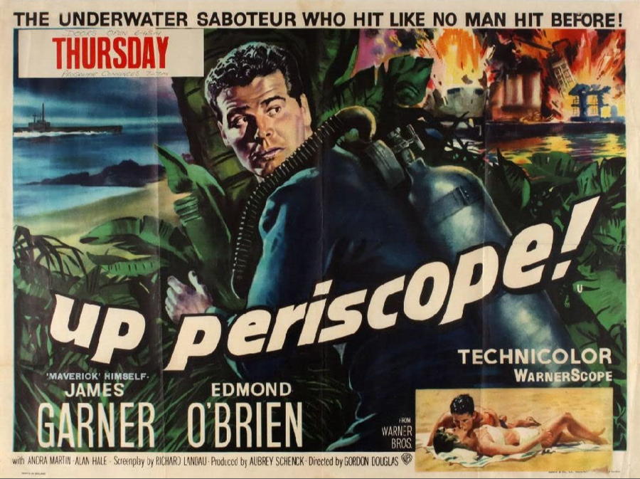 Up Periscope! is a ‘WarnerScope’ and Technicolor presentation and it’s directed by Gordon Douglas who almost defines a ‘solid Hollywood studio director”. He made nearly 100 films and TV episodes/TV movies. Starting in the mid-1930s with shorts and then B pictures he came into the spotlight in the 1950s when he signed for Warner Bros, staying until 1965. He was probably best-known for Westerns/action pictures and crime thrillers and he made many well-known films during the 1960s. His last major picture was They Call Me Mr. Tibbs! (1970) with Sidney Poitier. He retired at the end of the 1970s. Up Periscope! was in safe hands and I certainly found the film gripping. I even fast forwarded a couple of sequences because the tension as Braden is on the island and mustn’t be seen by the Japanese got to me. I can understand some of the more negative comments in the sense that there are only a couple of (very good) war combat action sequences when the submarine is under attack. Much more time is spent on the spying mission, also very effective but the romantic sub-plot rather detracts from the main narrative, even though it is used as something Braden thinks about while he is waiting for darkness on the island. At 112 minutes the film is arguably too long for its main genre purpose. On the other hand, we might argue that the context of Braden’s recruitment for the operation and the sense of community that is engendered by Ensign Malone (Alan Hale Jr.) are important in grounding this wartime action.