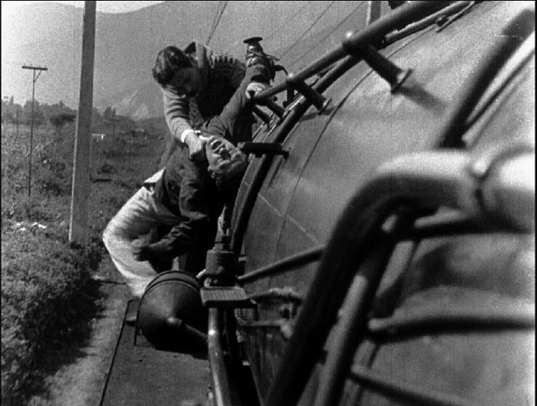 The film also uses moving cameras, frequently placed on an engine or tender or following along rail tracks. This is well done and the actors have some fairly dramatic stunts and actions. And the film uses superimpositions; one very effective one shows Paco watching his rival with Elena, sitting by a pool, and the image in his mind of her superimposed. The film effectively combines actuality footage with staged scenes and sequences. The editing of this is sharp and precise. I could not find a credit or listing for an editor on the film; it may have been the director or cinematographer.