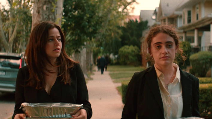 Weddings and funeral are universal settings for family events and they have been fertile ground for quarrels and revelations since storytelling developed in human communities. Shiva is the Jewish period of mourning and in this New York Jewish community Danielle (Rachel Sennott), a college student, has been asked by her parents to attend a shiva gathering for one of their friends. Danielle doesn’t know (or can’t remember) the person who died and she misses the funeral service because she is enjoying a session with her ‘sugar daddy’. This brief scene opens the film in long shot and we see Dani being paid for sex. The rest of the film is located in the middle-class home of the bereaved’s family.