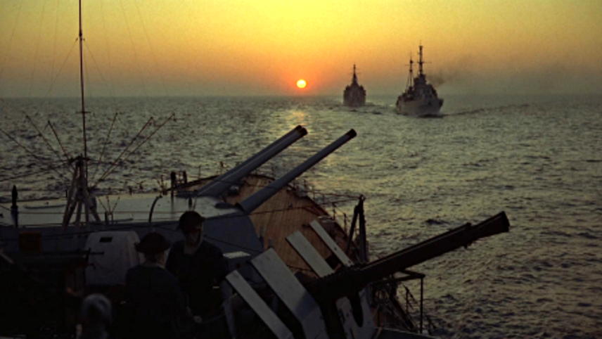 The ‘Battle of the River Plate’ was a naval battle in the early months of the war which saw three British light cruisers force the German pocket-battleship the ‘Admiral Graf Spee’ to scuttle in the estuary of the River Plate between neutral Uruguay and pro-axis Argentina. A ‘pocket-battleship’ was the British term for a German design that attempted to create a powerful ‘ship destroyer’ while staying within the constraints laid down by the Treaty of Versailles. The resultant ships were only one third of the tonnage of the later German battleships like the Tirpitz. They were diesel-powered, lighter but more efficiently armoured than Royal Navy vessels. They also had larger guns with greater range. This meant that they could outgun smaller cruisers and destroyers and outrun capital ships. Initially they were to be used to destroy British and Allied merchant ships in the Atlantic and Indian Oceans. The film sticks fairly closely to the real events of the engagement and its aftermath, so much so that at least one of the IMDb comments refers to the film as a documentary (and MUBI calls it a ‘docudrama’). It isn’t but it does represent a factually detailed story. It is interesting to watch and compare with contemporary films featuring similar engagements in that The Archers were able to find either the original ships or closely-related sister ships – at least on the British side. They had the advantage that production manager John Brabourne was the son-in-law of Louis Mountbatten who commanded the Mediterranean fleet of the Royal Navy in the early 1950s. The ‘Graf Spee’ was impersonated by the US Navy heavy cruiser USS Salem. There was only a limited amount of studio tank and ship model work required. Much of the movement of ships was actually shot in the Eastern Mediterranean. Michael Powell was able to shoot footage of three Royal Navy ships on exercises, so that the Archers didn’t have to pay to hire the ships.  Similarly, the USS Salem was on duty in the Mediterranean. This did mean however that Chris Challis had to shoot, using the heavy Vista Vision camera, in very tight time slots with virtually no preparation. The overall schedule for such an epic production was very tight and was acknowledged by the trade press (Kine Weekly) which praised The Archers production for efficiency.