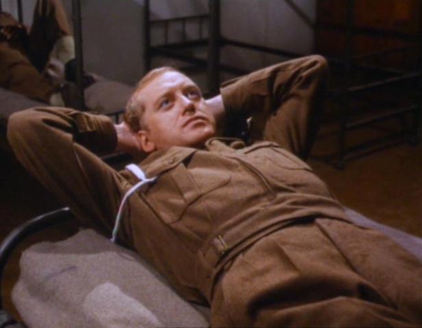 Initially, there is little indication which of the gunners are National Servicemen and which are ‘regular soldiers’ (i.e. professional soldiers who have ‘signed on’ for more than three years). All of the actors are too old to be raw National Service conscripts and, to confuse matters, John Thaw (Gunner Featherstone), the youngest of them (at 24 in 1966), was already well known to UK TV audiences as a military policeman in the series Redcap (ABC TV, 1964-66). The two actors most likely to be playing regular soldiers are Nicole Williamson as O’Rourke and Ian Holm as Flynn. These two are almost polar opposites – O’Rourke is a tall, wild Catholic Irishman from the south, Flynn is a short, reserved Protestant Ulsterman. The inevitable religious conflict bubbles below the surface (and in retrospect prompts us to reflect on what might have happened in the North of Ireland if National Service had continued and conscripts had patrolled the streets of Belfast and Derry in the 1970s). More relevant here is that O’Rourke is the main source of anger channeled through Evans, whereas Flynn tries, in vain, to talk sense into the young NCO and help him wherever possible.