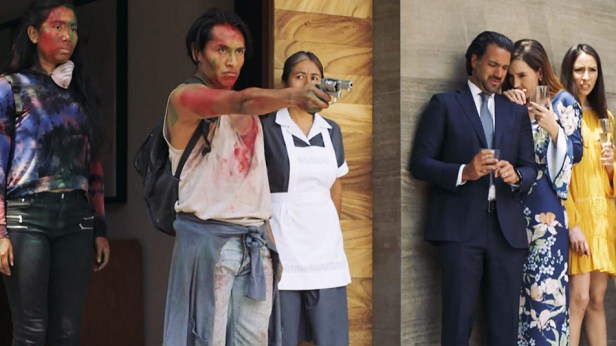New Order begins with a montage of images which act rather like those at the beginning of episodes of TV serials, teasing us with shocking images from later scenes. When the narrative proper begins we see disruption and chaos in a hospital and a clear indication that violent events are happening in the city centre. The action then cuts to a lavish wedding party in an upper-class gated community. Marianne (Naian González Norvind), the daughter of the house, is to be married to Alan, an architect. There are many guests in the large modern mansion. A judge is due to arrive to register the marriage but on the radio/TV there are reports of looting and violence elsewhere in the sprawling city region. The specific inciting moment of the narrative is the arrival at the gates of Rolando, an ex-employee of the family, a servant who worked closely with the family and especially the children Marianne and her older brother Daniel. Ronaldo is seeking to borrow a large sum of money because his wife is dangerously ill and the public hospital is overwhelmed. If we have been concentrating we recognise him from the opening hospital scenes. Unless he can take his wife to a private hospital she will die. He is an almost Biblical figure, the poor man at the gate, arriving at the feast. But is his plea a ruse? Is he connected to the ‘trouble’ in the city as one character seems to suggest? The crucial decision is Marianne’s. She decides to leave her wedding in order to drive the couple to the private hospital. From this decision will come the trajectory of the narrative. Through Marianne, a wealthy young woman who has some form of social conscience, we will see the full impact of the uprising in the city and how it is put down. Some audiences have seen this as a skewed narrative, in which everything is from the perspective of the privileged. Others argue that it reveals the naivety of young wealthy characters like Marianne who live in their bubble and assume that their generosity will in some way assuage the angry demands of the poor. Marianne is the central character but in some ways it is Cristian, one of the servants closely linked to the family who most drives the action forward.