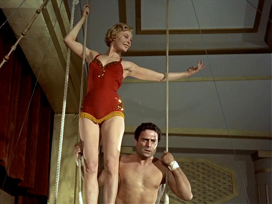 Obsession is a French-Italian co-production, perhaps the most common form of production partnership during the 1950s and 1960s. Here it puts the Italian star Raf Vallone alongside the great French star Michèle Morgan as ‘The Giovannis’ – a trapeze act playing circus arenas and touring theatrical venues in Paris and other cities and resorts in France. After working together for a while, the couple marry and all is fine until Aldo (Vallone) is injured and their manager pairs Hélène (Morgan) with another trapeze artist. Aldo is not very happy about this, especially when the new partner turns out to be someone he used to work with. I don’t want to spoil the narrative so I’ll just say that Hélène eventually finds herself doubting her husband in very difficult circumstances for both the couple and their colleagues. Setting the story in the world of trapeze artists gives a further twist to the ‘insecurity’ of the central characters, especially if you are as nervous as I am watching high-wire acts. According to reports Michèle Morgan did some of her own stunts in these scenes. If so, my admiration for her rises ever further. The film’s Italian title translates as something like ‘Asking for grace’. Since it clearly represents a courtroom situation this title is probably more helpful than the French ‘Obsession’. I wasn’t sure who was the obsessed character.