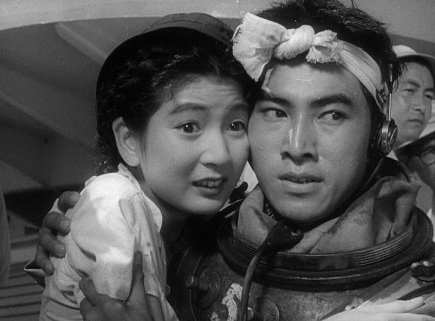 The expectation might be that Dr. Yamane is to become the protagonist in the narrative, but fairly quickly he is sidelined as the younger characters come to the fore. Emiko is Yamane’s daughter and a few brief scenes see her interaction with her father which matches scenes in the family melodramas of Ozu Yasujiro and other directors of the period. This doesn’t develop but it links directly to the fate of the people displaced by Godzilla’s appearance and the disruption caused in the Tokyo Bay region. Emiko is in a relationship with Captain Ogata but she is also recovering from an earlier relationship with Dr. Serizawa Daisuke, the young scientist who is believed to have discovered a weapon that could stop Godzilla. Emiko finds herself caught between three men with different ideas about how to respond to the emergency. The script cleverly uses a set of family relationships and a romantic struggle for Emiko to drive the narrative forward to its conclusion with Ogata and Serizawa working together.
