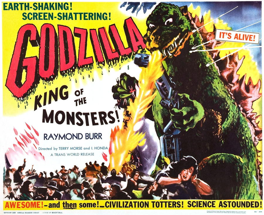What is also important to realise is that control over scripts in Japan had only just ended in 1952 with the withdrawal of the Allied (i.e. American) Occupation forces. This is particularly relevant for Godzilla. In 1955 Toho sold the rights to create an American version of the film to Edmund Goldman and later Joseph E. Levine of Embassy Pictures would become involved. (Levine would later buy the rights Hercules from Italy in 1959 in a similar profitable move.) The US version cut the original film quite savagely, dubbed much of the Japanese into English and inserted a new angle in which Raymond Burr (who appeared in Hitchcock’s Rear Window in 1954) is an American journalist reporting on the monster’s rampage in Tokyo. The deletions seemingly removed all references to nuclear war and its impact on the Japanese population, reducing the film to a monster pic and not much more. The revised film, titled Godzilla, King of Monsters (1956) then moved into first North American and then international distribution. The original film wasn’t seen outside Japan until 2004. The obvious point to make is that the inference in the film that Godzilla is in some way a beast re-activated by radiation and that its formidable weapon is the ‘atomic breath’ it creates from nuclear energy, is a direct anti-American statement. But I think it goes much further than that.