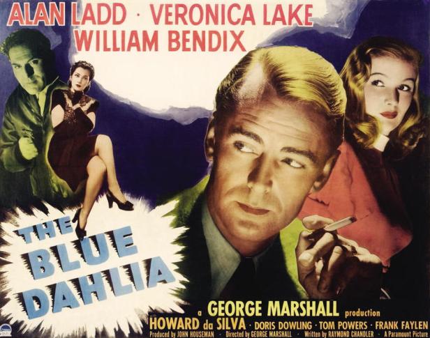 The Blue Dahlia is the only film scripted solely by Raymond Chandler. IMDb lists 40 films and TV titles to which Chandler’s name has been attached but most of these are adaptations by other writers of Chandler’s novels or short stories. At other times Chandler was part of a screenwriting team. Given Chandler’s antagonistic relationship with Hollywood, his partial involvement as screenplay writer on several films is not surprising. The circumstances which led to The Blue Dahlia were unusual and perhaps depend a great deal on how the studio system in the mid 1940s worked. Chandler’s time at Paramount was coming to an end but suddenly the studio was faced with a potential disaster. Alan Ladd, the studio’s leading male action star, was due to return to military service and they needed a property for him at short notice to go directly into production. John Houseman, a producer at Paramount at that time knew Chandler and he was the only one at the studio who shared an English public school background. He used this leverage to get Chandler to agree to write an original screenplay very quickly. George Marshall a veteran director who was very efficient if not particularly creative was assigned alongside Veronica Lake and William Bendix as the other two leading players, both of whom had worked with Ladd successfully at the studio.