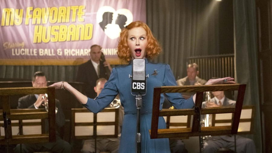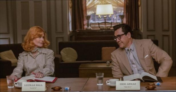 Though the film clearly hinges on the relationship between Lucy and Desi, the other five important characters do give the film the feel of an ensemble piece. J.K. Simmons and Nina Arianda play the actors William Frawley and Vivian Vance, who are the landlords and friends of Lucy and Desi on the show. Alia Shawkat and Jake Lacy play the two writers and Tony Hale plays the producer. These three roles are also played by three older actors in ‘flashforwards’ when they appear as ‘talking heads’ witnesses in a documentary biopic about the show. In effect, we have many interactions across three different time periods which could get a little confusing for audiences. Almost the entire narrative takes place in the TV studio apart from the 1940s flashbacks and the later interviews.