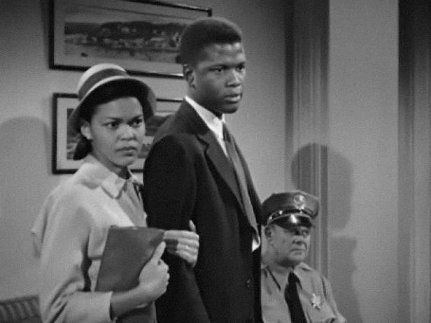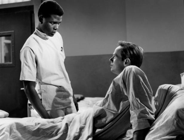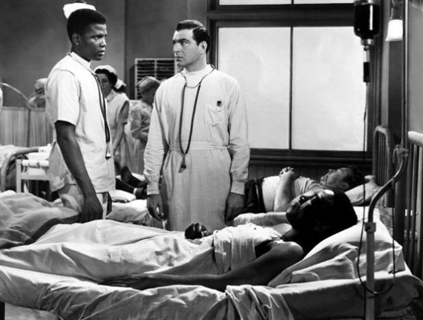 Wharton represents another ‘type’ – the white liberal who believes that he has found the rational position inside a racist society. He attempts to deal with the situation that Dr. Brooks finds himself in by asserting that he supports Brooks as a ‘good doctor’, not because he is a ‘Negro doctor’ in a difficult position. He thus finds himself between Brooks, who understands his own position quite clearly, and the head of the hospital who is worried by the newspaper report of the incident. In order to better understand the arguments about Poitier’s acting persona I acquired a copy of The Poitier Effect: Racial Melodrama and Fantasies of Reconciliation by Sharon Willis (University of Minnesota Press 2015). Unfortunately Ms Willis does not, as far as I can see at the moment, discuss No Way Out. Instead she focuses on what she sees as Poitier the ‘teacher’ whether in teacher roles such as To Sir With Love (US-UK 1967), as a student in The Blackboard Jungle (1955) or an escaped convicted man in The Defiant Ones (US 1958). In the first of these Poitier as a Caribbean migrant teaches white London kids. In the second he challenges Glenn Ford as his white teacher and in the third he tries to show Tony Curtis how to survive on the run. Different roles but in each he teaches a white character and by extension a white audience. The outcome of this is not, however, to instigate an exchange of ideas and understanding but more to show that a black man can be useful/helpful etc. – and therefore not threatening. Willis extends this analysis to include Poitier’s role in In the Heat of the Night (1967). I’ve just watched that so some analysis will follow.