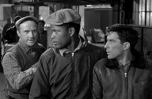 The promotion of Edge of the City and much of the writing around the film focuses on Malick’s ‘bigotry’ and in particular his racism. Malick is certainly a bigot and a bully and racism is part of that bigotry. But I’m not sure that institutional racism in terms of employment opportunities on the docks is represented in the film. I’ve seen reviews that suggest that the dock workers are all white except Tommy, but this isn’t true. There must be four or five other black workers but I don’t think they are speaking parts – perhaps their silence is a feature of their secondary status? (See the black worker in the background of the image above.) But Tommy is certainly vocal and in a position of some authority. It does look as if Malick’s gang is whites only, but I can’t be sure. Although I enjoyed the film, I was disappointed that there was no union presence as such and that other workers were prepared to stand back both when Malick was the attacker and when he was losing a fight or an argument. Tommy doesn’t seem to be associated with the other black workers. Edge of the City is not really attempting to copy On The Waterfront as some reviews suggest. Axel is really the protagonist and the narrative is his ‘journey’ towards finding himself and finding the courage to act. Poitier’s character is arguably another ‘good Negro’ teaching whites how to work and live with dignity and purpose – and suffering for it.