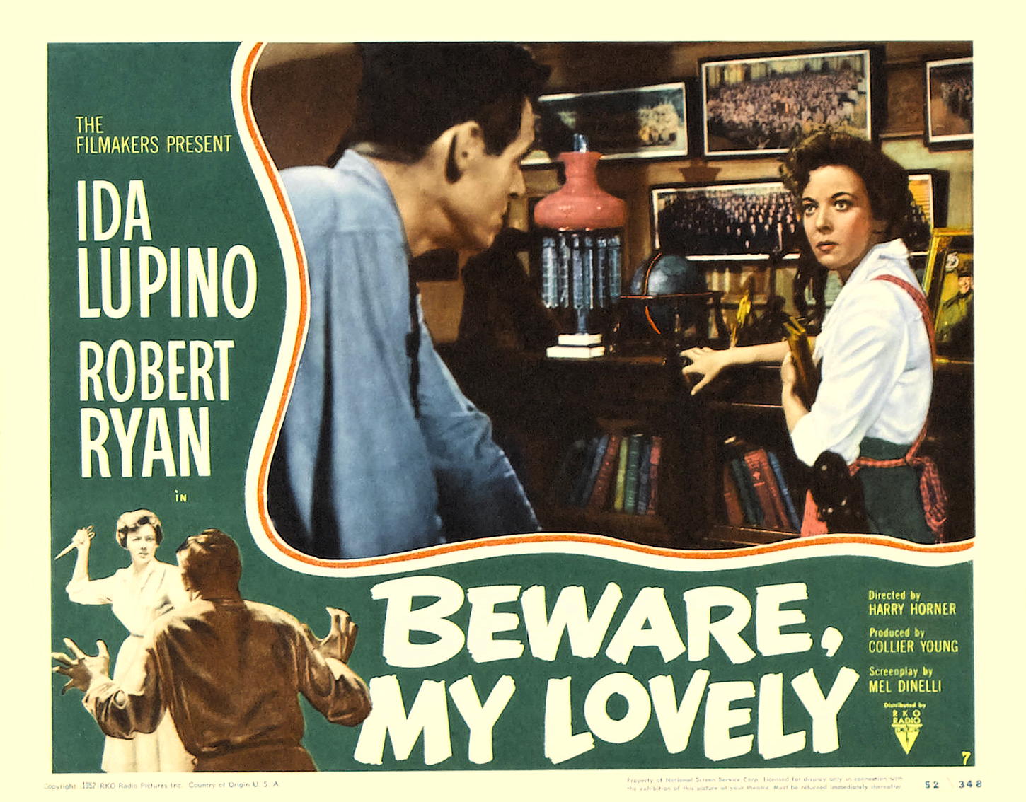 This is a shortish (77 minutes) suspense thriller made for RKO by The Filmakers, the independent production company founded by Ida Lupino and Collier Young. The film was shot in just 18 days in July/August 1951 but delayed by RKO for a year. This followed a pattern given the eccentric behaviour of Howard Hughes as the owner of RKO. On Dangerous Ground, which like this film starred Ida Lupino and Robert Ryan, had similarly been delayed. One suggestion is that Hughes as part of his enthusiastic support for the communist witch hunt of the HUAC years was reluctant to release a film with Ryan whom he saw as a leftist. Lupino, a staunch Democrat managed to avoid trouble but she was friends with many of those hounded as communists. At this point she had directed four films for The Filmakers but she argued for Harry Horner to take the directorial role. Horner was a Czech émigré who had arrived in the US in the mid 1930s with Max Rheinhardt and eventually entered Hollywood as a set designer, winning two Oscars. He’d worked for Lupino as Production Designer on Outrage (1950). Beware, My Lovely was actually his first feature but because of the delayed release, his second feature came out first. It appears that Lupino did actually direct a couple of scenes when Horner’s wife was in hospital.