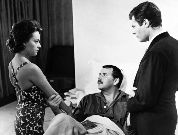 Both Mastroianni and Moreau were well-known actors in Europe in 1961. Were they ‘stars’? Moreau had certainly been in many films, some of them notable successes by this point, especially her films for Louis Malle, Ascenseur pour l’échafaud and Les amants, both in 1958, but she hadn’t yet achieved the string of notable performances throughout the 1960s and into the 1970s. She does present a strong star persona in La notte. She doesn’t say much and she often appears quite solemn, but I feel like I could watch her walking through streets for a long time, marvelling at just how she moves, how she holds herself, even simply how she wears her costumes. She was only in her early 30s when she made this film but she seems older. The narrative depends to some extent on Monica Vitti’s youthfulness by comparison. But Vitti was actually less than four years younger than Moreau. I did notice that in the contest about who sported the thinnest spaghetti straps on her little black dress Vitti did win. I think what really interests me here is the extent to which our readings change over time. Do we now feel much more for Lidia and the way she seems to be pushed out by Giovanni’s celebrity? Looking back, Moreau and Mastroianni were of equal status but he is the agent of the narrative. Moreau as Lidia does get screen time on her own and she acts in ways that reveal things about herself as well as commenting on her relationship with Giovanni. She also introduces aspects of a critique of Italian bourgeois society in 1961. Mastroianni is a beautiful man but in many roles he appears weak and vulnerable. Although as Giovanni his actions structure the events of the day – the couple go to the book launch and the party where he is a significant figure – he seems to be being manipulated and played with, especially by Valentina and her father.