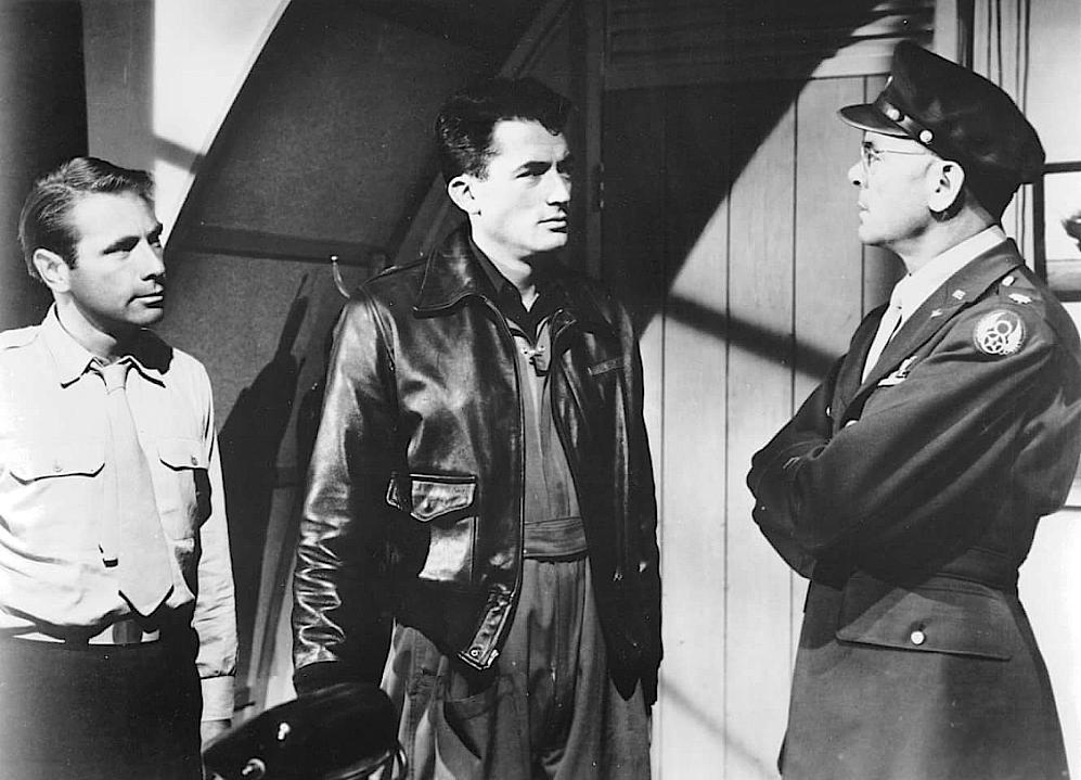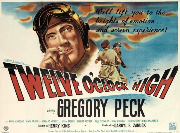 12 O’Clock High was first a 1948 novel by Sy Bartlett and Beirne Lay, Jr., both of whom had experience of the bombing campaign – Lay flew on the Regensburg raid. The rights were acquired by Twentieth Century Fox and the film was shot largely in the US with some second unit work in the UK during 1949. It went on general release in North America in January 1950. The production was able to use B17s still flying and also actual combat footage. The resulting film is now considered one of the most accurate and realistic in its portrayal of the bomber groups. The lead role of Lt-General Frank Savage was played by Gregory Peck (in the photo above he seems to be a ‘one star general’). As is often the case, it’s hard to imagine the film with someone else in the role, but he was by no means the first choice. Fortunately he turned out to be excellent in the role. The film was directed by Henry King who would then team up with Peck for three further films in the 1950s. Peck was only 33 when he played Savage but his deep voice and imposing stature gave him authority. King was Fox’s ‘go to’ director for all kinds of films in the 1940s and 1950s. He is listed with over 100 credits for directing as well as a similar number for acting and his career lasted from the 1910s to 1962. In some ways he was Fox’s answer to Michael Curtiz at Warners. Neither were taken up by the French critics as auteurs but both were highly dependable and consistently made highly-rated films. Twelve O’Clock High was shot by Leon Shamroy with music by Alfred Newman. It ran for well over two hours and for a Hollywood war picture was very ‘talky’. The only combat sequence occurs in the last section of the film.