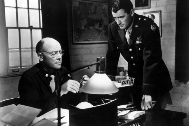 Savage decides to take the opposite path to his friend Davenport, increasing training exercises, demoting flyers he sees as undisciplined and using humiliation and shaming to create discipline. At the crunch point he appears to have antagonised virtually all his men with just the base adjutant Major Stovall (Dean Jagger) recognising what he is doing and why. Stovall (the man in the opening whose flashback starts the story) is a First World War veteran. The drama then becomes focused on whether Savage can keep the group together and whether his methods make the men more effective on bombing raids. The more well-trained and disciplined they are, the less likely they are to make mistakes and to jeopardise the safety of the whole group. The group flies in formation so anyone ‘breaking away’ threatens the integrity of group defence. How Savage achieves his aims and what costs his men (and Savage himself) have to pay are the issues that make up the bulk of the narrative. This is a narrative about leadership and the plot revolves around Savage’s relationships with two men in particular. One is Lt. Col. Ben Gately (Hugh Marlowe) the putative leader who must be disciplined and the other is Lt. Bishop (Robert Patten) the young pilot who has already deceived a citation for bravery.