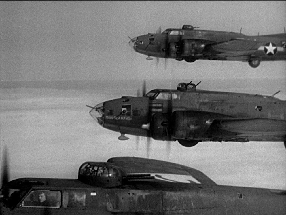 I was taken aback to stumble across a blog posting about this film which attempted to use it to call for more determined leadership of the far right cause in the US today. Gregory Peck would have been appalled by this as he remained a staunch liberal Democrat throughout his career as far as I am aware. In some ways the ideological base of the bomber operation is completely collective – the crews survive because they stick together. Anyone who disobeys and breaks out of formation threatens the safety of all. The idea of a strong leader is, however, more controversial. His job is to push the men to make more and more successful flights, improving bombing accuracy. To do this, the aircraft had to fly on a dead straight course with the bomb-aimer taking control of the aircraft. This made the aircraft more vulnerable to both anti-aircraft fire and enemy fighters. This isn’t a gung-ho film – celebrating success would have to wait until the Mustangs arrived, but it does show the impact on Savage and his crews.