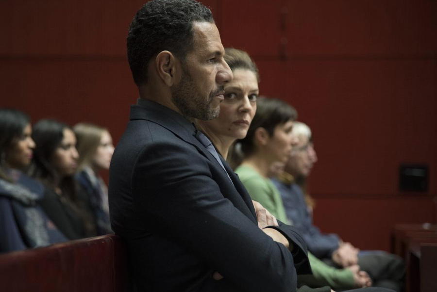 This unusual narrative offers us a courtroom drama from an odd perspective – that of an ‘observer’ in the court. We are not placed ‘with’ the prosecution or defence case. It also allows us to identify with the father of the girl in question, Lise Bataille (Melissa Guers). Bruno Bataille (Roschdy Zem) is at times an observer in court but we also see him trying to maintain some discipline at home. It is clear that he doesn’t know Lise as well as he thought he did. Lise’s mother, Céline (Chiara Mastroianni) is absent from the court for the first part of the proceedings – she must work as both she and her husband are self-employed. With two such starry actors as the parents, it’s interesting that Anaïs Demoustier was given the role of the Prosecutor. Her performance is quite chilling and I found it unconvincing (and I’m a fan of Ms Demoustier). The French judicial procedure seems to conduct a case like this – a charge of murder – as requiring the presence of three avocats, one for the Prosecution, one for the Defence and a third representing the victim (in this case the mother of the murdered girl, Flora?). The court is presided over by a judge. Compared to an English Crown Court, the proceedings are more informal but allow examination of any witness, or the accused, by the judge and the three avocats.