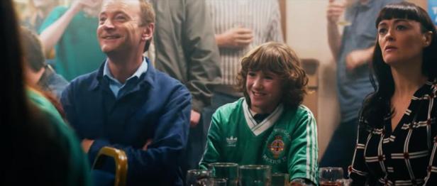 Overall this is an enjoyable film which fully engaged me, but it helps if you are familiar with Northern Ireland and with UK football during the 1980s. For those less familiar, the narrative might seem a little bitty. This is because there are several individual stories within the structure of the team’s qualification and then travel to the World Cup and participation in the group stage. The individuals picked out in the Northern Ireland team are the coach, Billy Bingham, the players Sammy McIlroy, Pat Jennings, Norman Whiteside and especially David Campbell. Campbell was the ‘new boy’ in the team. Although born just outside Derry, his father had moved the family to Letterkenny over the border in the Republic and this means that he frequently crossed the border before moving to England to play football. At this point he was on the books of First Division Nottingham Forest. There is also a narrative organised around the football commentator Jackie Fullerton and his cameraman. Perhaps most important in some ways is the fan perspective. The family selected for this purpose throws the focus on Tommy (Art Parkinson) who celebrates his 10th birthday during the narrative. I think his family includes a Protestant dad and Catholic mum and therefore the family represent the two communities coming together to support the national team despite the fact that the armed conflict is still present on the streets of Belfast and the checkpoints across the country.