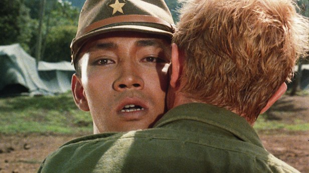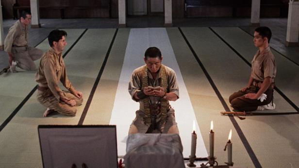 My own feeling is that Bowie and Sakamoto both give extraordinary performances. They act as ‘stars’ and as if they inhabit another universe. No doubt Oshima gave Sakamoto detailed instruction about how a young man from a samurai family might have acted at the time. I read some references to Bowie’s experience on the shoot which suggests that Oshima gave little direction to the Western actors. I wouldn’t be surprised if Bowie constructed his own part from the basis of the script. As an aside, before this viewing I had never been aware of the fact that Bowie had an eye condition in which his left pupil remained permanently expanded at all times as the result of an accident. This becomes very evident in the many close-ups in the film. Celliers is the most mysterious character in the narrative and the script gives us flashbacks to a ‘house in the country’ and his time in school with his younger brother. This memory is odd for a number of reasons. The major location for the film production was Rarotonga, the largest of the Cook Islands, an independent but ‘associated state’ of New Zealand located in the centre of Polynesia. Celliers’ family house is represented by a location in Auckland. The character in the original story was South African and Bowie has a non-definable accent. The school has a uniform and an ethos that implies a British-style public school and Bowie is shown in school uniform as an 18 year-old with his younger brother, supposedly only a few years younger. Oshima cast a young actor as the 12 year-old Jack Celliers but his younger brother is played by the same actor in two scenes supposedly six years apart. By contrast, Sakamoto as Yonoi refers to his memories but we don’t see him as a younger man. Where Celliers is conscious of his ‘wrong’ behaviour towards his brother (his ‘betrayal’), Yonoi is driven by his anguish about what happened to the young officers he knew in 1936 whom he had to leave behind when he was sent to Manchuria and we have to ask why such a dynamic young officer is running a POW camp in Java? (The ‘young officers’ from 1936 were part of a revolt against the leadership of the Imperial Japanese Army – this reference would have significant resonance in Japan but left many Western audiences non-plussed.) Celliers and Yonoi are in some ways alike but they understand each other only at a basic emotional level – and their emotions are clouded by their memories and perhaps a repressed homo-erotic desire. At this point I should say that while I recognise and respect the performances of both actors (and Sakamoto’s music score for the film is wonderful) they didn’t interest me as much as Lawrence and Hara. I realise now that I perhaps missed the thrust of Oshima’s perspective, but I think I did still engage with the question of ‘Japaneseness’, albeit through different characters.