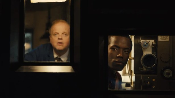 The projection box appears to be a studio set with actual projectors; the latter provided by the Projected Picture Trust. The projectionist in the film, Norman (Toby Jones) tells a staff member that they are K.18s. This is a projector made by the Kaylee Company, which operated in Leeds from 1948 until 1958; becoming a subsidiary of Gaumont in that period. Originally Kershaw & Sons Ltd, later Gaumont-British Kaylee, the firm supplied the majority of British cinemas in the 1950s. A later Kaylee model, using carbon arc illumination, can be seen in the foyer of the Pictureville Cinema at Bradford’s Media Museum: the Cinema Museum in London has several Kaylee projectors on show. YouTube has short videos on projectors using carbon arc illumination. In 2011 the disused Lyric Cinema in Leeds still had a pair of carbon arc projectors. A project by the Pavilion Arts Project saw the projectors repaired and their carbon arc lights used for a series of screenings; one was an early film which featured the work of Roger Deakins. The Lyric building remains; whether the projectors remain is unknown. You can check out the Parkway programme here.