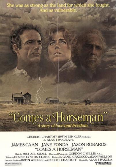 The script is by Dennis Lynton Clark from his own original story. It appears to be his only cinema film script but he wrote two others for TV movies and he worked as Production Designer, Costume Designer or Art director on a few other films. The music score is by Michael Small and the film editor is Marion Rothman both experienced filmmakers, Small having worked on Pakula films earlier in the decade. This was certainly a prestige picture. Caan in the late 1970s was still to some extent coasting on his Godfather role from 1971 but he had other hits including Freebie and the Bean (1974), Rollerball (1975) and Funny Lady (1975). Fonda was at the peak of her career, winning an Oscar for Klute (1971, directed by Pakula) and box office success for Julia (1977) and Coming Home (1977) plus featuring for Jean Luc Godard in Tout va bien (1972) and making several independent films. In the early 1970s she was also a political activist, famously visiting Hanoi (like several other Americans) and being attacked by the US media. She was for me the star of Comes a Horseman. Jason Robards in 1978 was a successful ‘star actor’ and for me he was a distinctive figure in Leone’s Once Upon a Time in the West (1968) and in two Peckinpah films, The Ballad of Cable Hogue (1970) and Pat Garrett and Billy the Kid (1973). In 1976 he had played Ben Bradlee in Pakula’s adaptation of All the President’s Men. He won two Oscars for Best Supporting Actor for All the President’s Men and for Julia as support to Fonda. The surprise package in the casting was Richard Farnsworth, who as Dodger was Oscar-nominated as Best Supporting Actor. He had first been a stuntman and then a bit part player in Westerns. In Comes a Horseman he ‘plays older’. He was only 58 but looks and acts like someone ten years older.